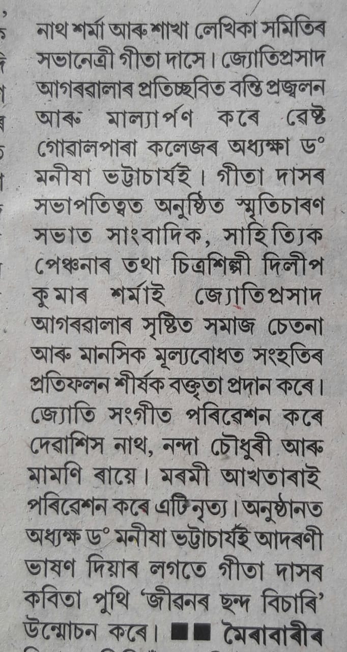 Print media published news about West Goalpara College for Observed Silpi Divas for death Anniversary of Jyoti Prasad Agarwala on 18.01.2023